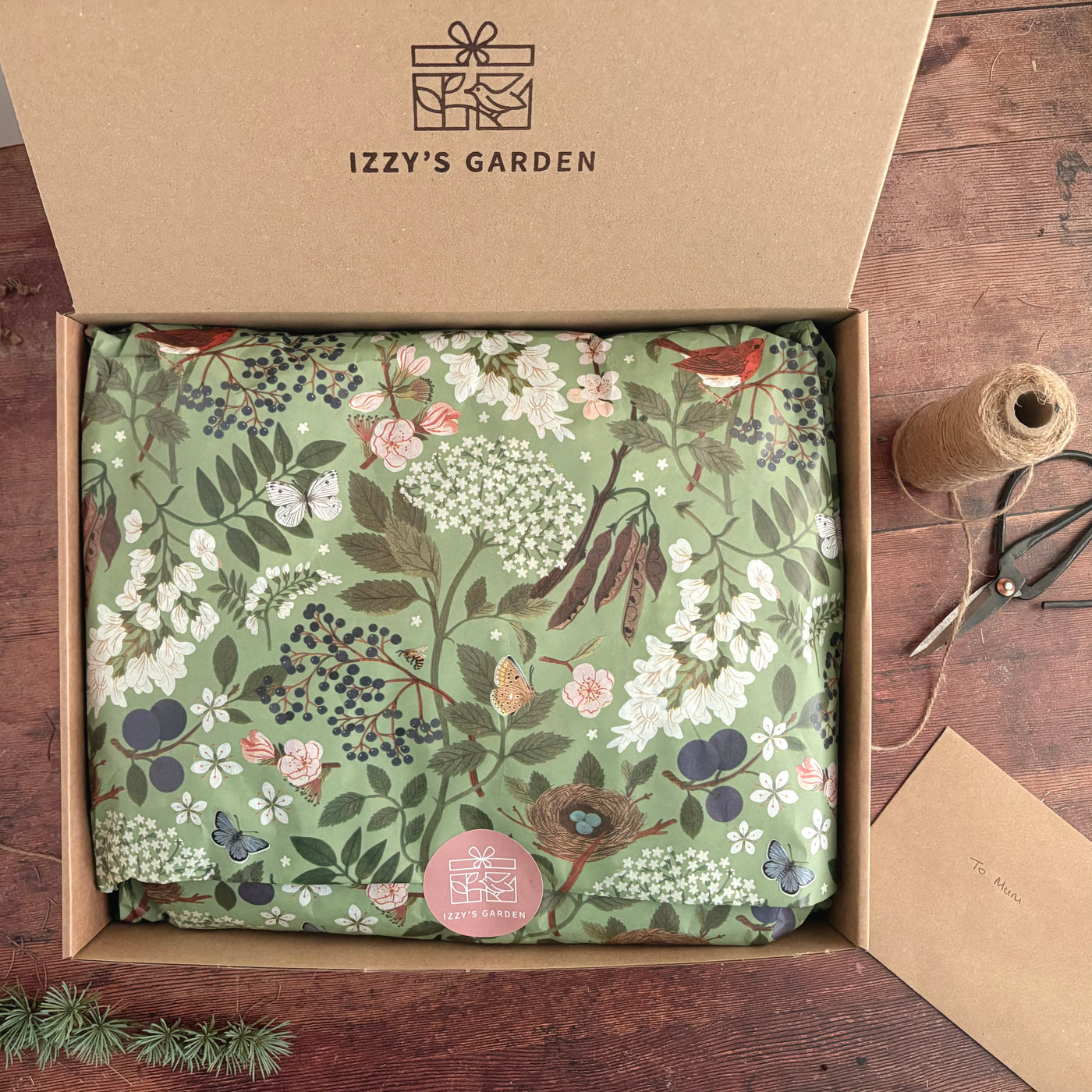 Gift wrap options include beautiful paper wrap, hamper basket or useful wooden trug.