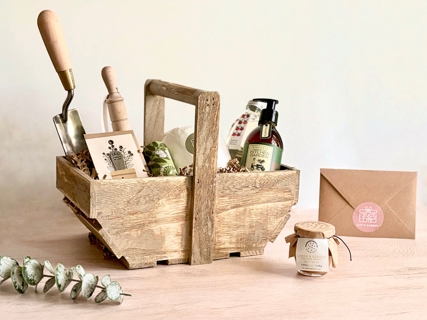 Gift wrap options include beautiful paper wrap, hamper basket or useful wooden trug.