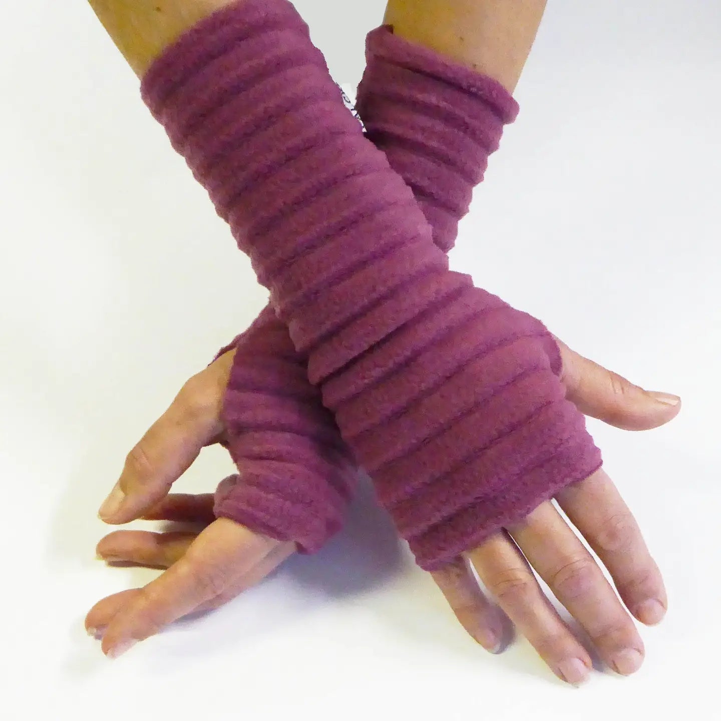 Soft pleated wristees® in raspberry pink. Wristies keep you warm from the cold outdoors and indoors. A perfect choice for anyone who needs warm hands with their fingers free.