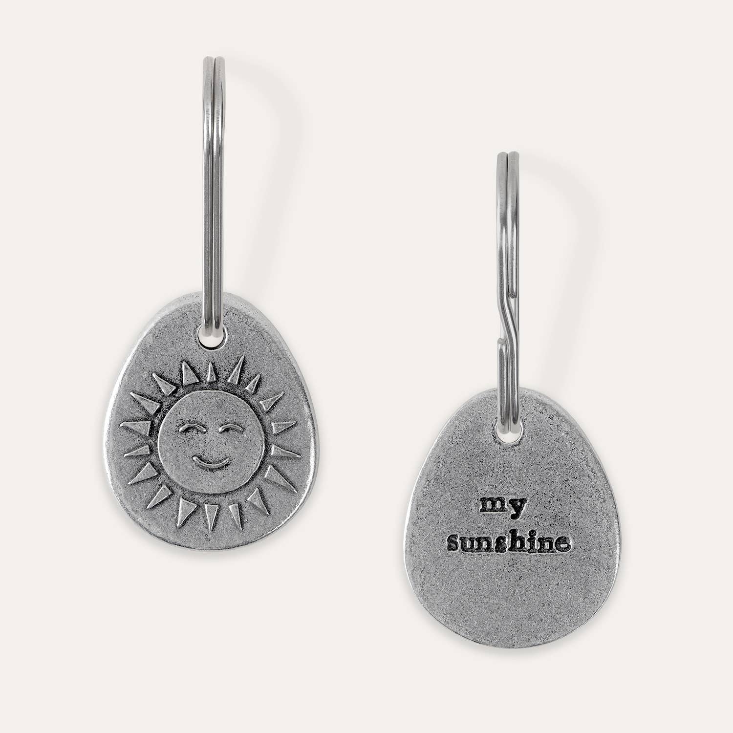 A bright and happy keyring to celebrate the ones you love. This keyring holds a teardrop shaped token featuring a smiling sun and has the phrase "my sunshine" stamped on the back.